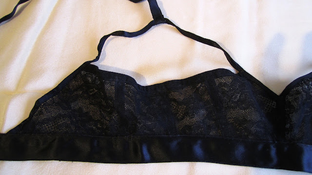 Firstly, the bra is lace that has been backed with a soft silk netting and then attached to a silk band, with silk ribbon straps.